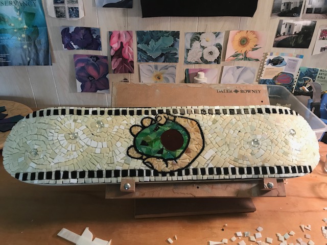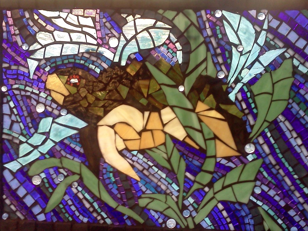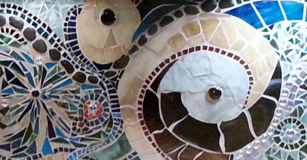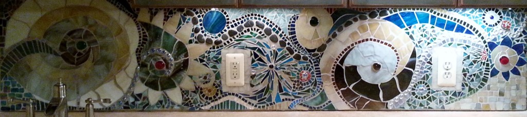 close up on NautilusAnother close up on NautilusNautilus: a back splash lovingly done for Mom and DadTurtle Turtle: a back splash for my sweetheart and his bathroomPoppy: Georgia O’Keefe inspired. Currently getting re-worked because I used plexiglass as substrate. Lesson: Plexiglass bends. 😦The first mosaic house number I ever didBowling Ball–way harder than I thought it would be. I have about 10 bolwing balls waiting for more glass-lovin’After collecting more broken dishes, this partial wall was creative process to function.